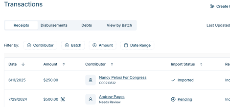 Every import of new transactions, whether using our Import Tool or automated Actblue or Numero ingestion, will filter contacts through our proprietary de-duplication tool. Visit the Imports Menu to see Imports with "Matches Available" for your review.