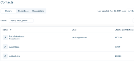 - Contacts. Manage donors, committees, and organizations (such as vendors).