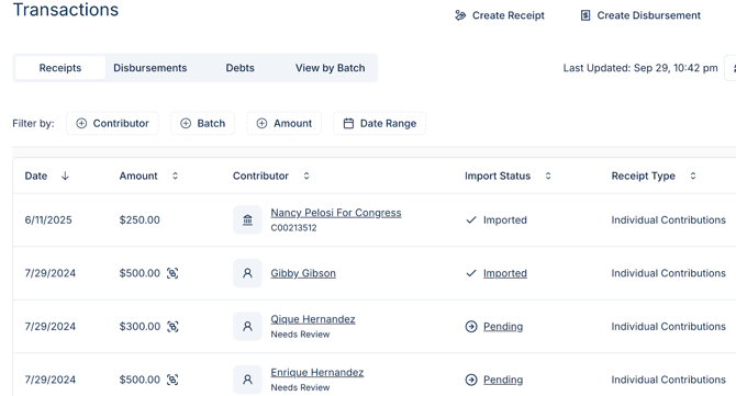 - Reconciliation. Reconcile your transactions with downloadable CSVs of Schedule A and Schedule B transactions, as well as a 3x report preview.