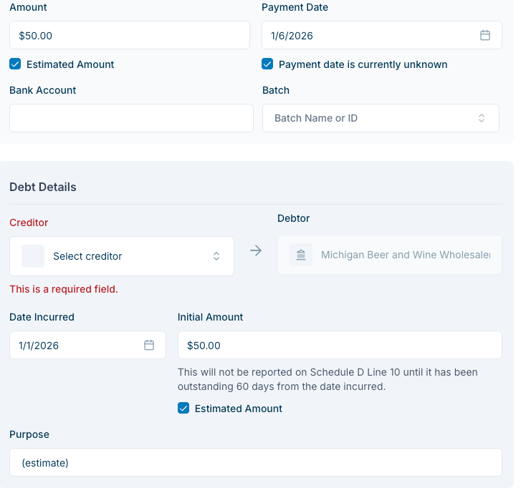 Estimated Amount. Check this box if the amount is estimated. This will pre-fill the Purpose field with “(estimated amount)”.