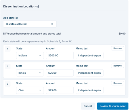 - If the IE is disseminated in multiple states: You’ll be able to fill the State, Amount, and Memo Text for each state.
