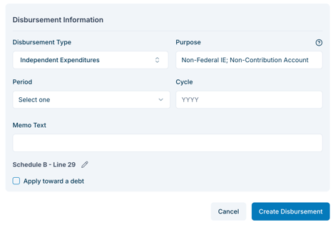 Once you Create the Disbursement at the bottom of this page, the Debt (if applicable) will be saved and linked to this Independent Expenditure.
