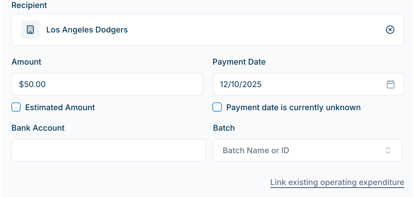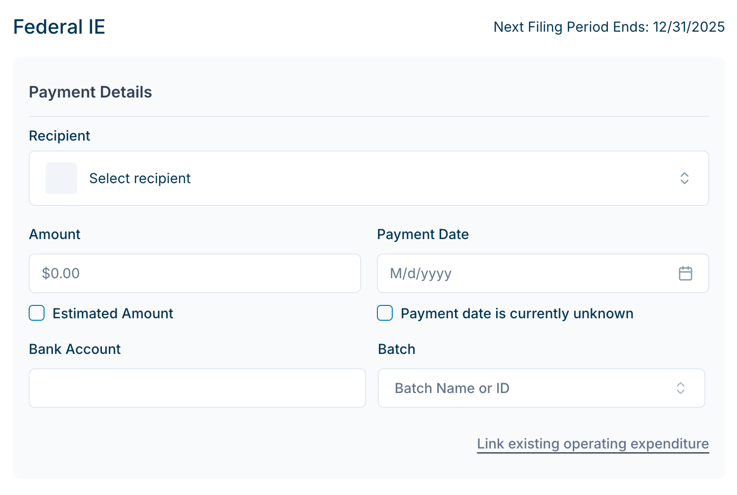 Link to an existing operating expenditure - If needed, this will allow you to search existing Disbursements for the Recipient in your database to link to this Independent Expenditure.