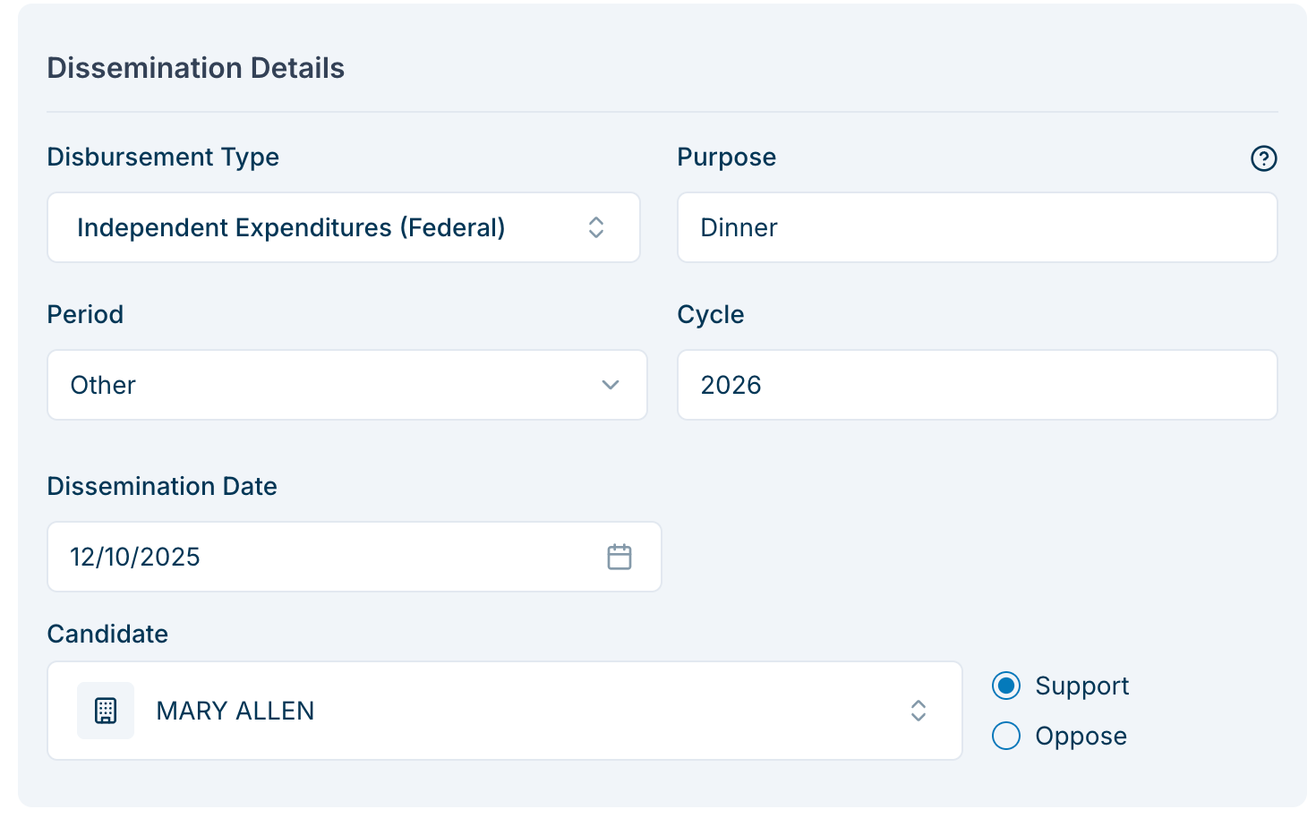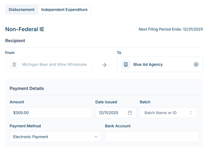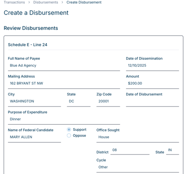 The Non-Federal Independent Expenditure has fewer scenarios and fields, so a Review Disbursement step does not appear. When you click Create Disbursement, the Non-Federal IE will be finalized and saved to your database.