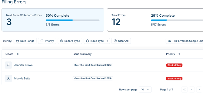 Warchest Compliance will flag over-the-limit contributions in the Filing Error tool under Reports. You can click through each flagged Receipt here to make reattributions: