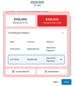 Our reattribution flow allows users to split a receipt across periods and cycles (e.g. primary vs. general) or donors (e.g. partners sharing a bank account).