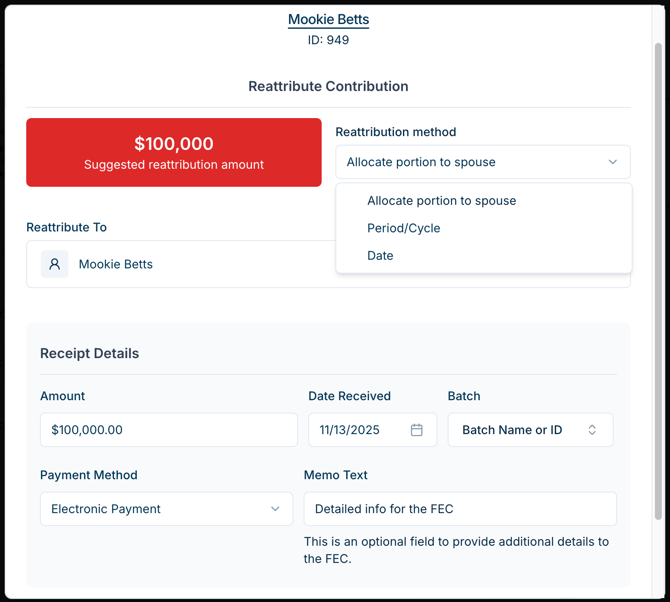 - Adjust the amount you want to reattribute to a new Receipt. You’ll have the option to provide Memo Text for Form 3x.