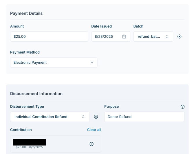 If a donor requests refunds on multiple donations, each individual donation will have a corresponding disbursement for an amount equal to the original donation.