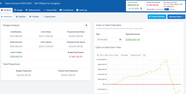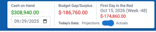 - When set to Projections, today’s numbers reflect your expected fundraising and spending.